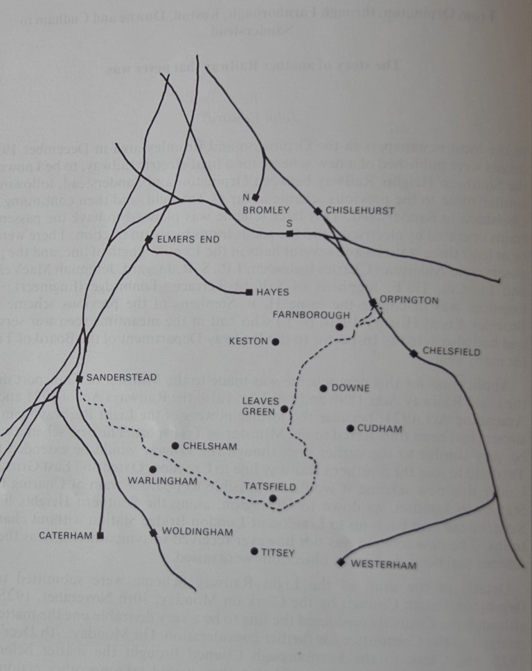 The line would commence just south of Orpington station, where there would be connections to both the up and down main lines.  The two spurs would combine a short distance from the station, and from that point on the line would be single track. It would initially head south  through Farnborough, Keston, Downe, Cudham and Biggin Hill to Tatsfield, then west via Titsey, Chelsham and Warlingham to Sanderstead, just south of Croydon, where it would meet the main line to London from Uckfield and East Grinstead, see map.   Through services onto the main lines at both ends were envisaged, with trains able to originate from and terminate at Charing Cross and Victoria respectively. The central section being a Light Railway would be subject to a 25mph speed limit. The line would be fully electrified for use by passenger trains, while freight services would be steam-hauled..