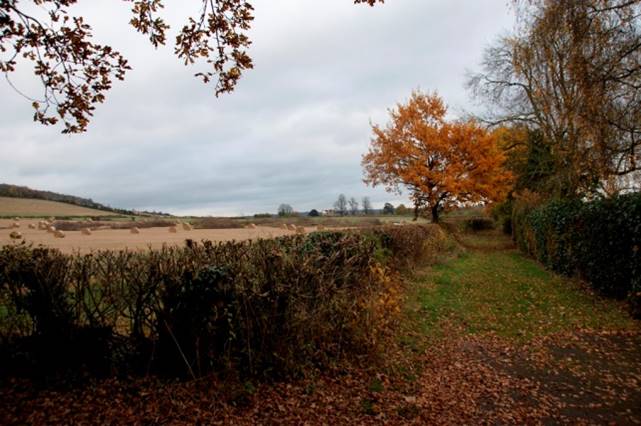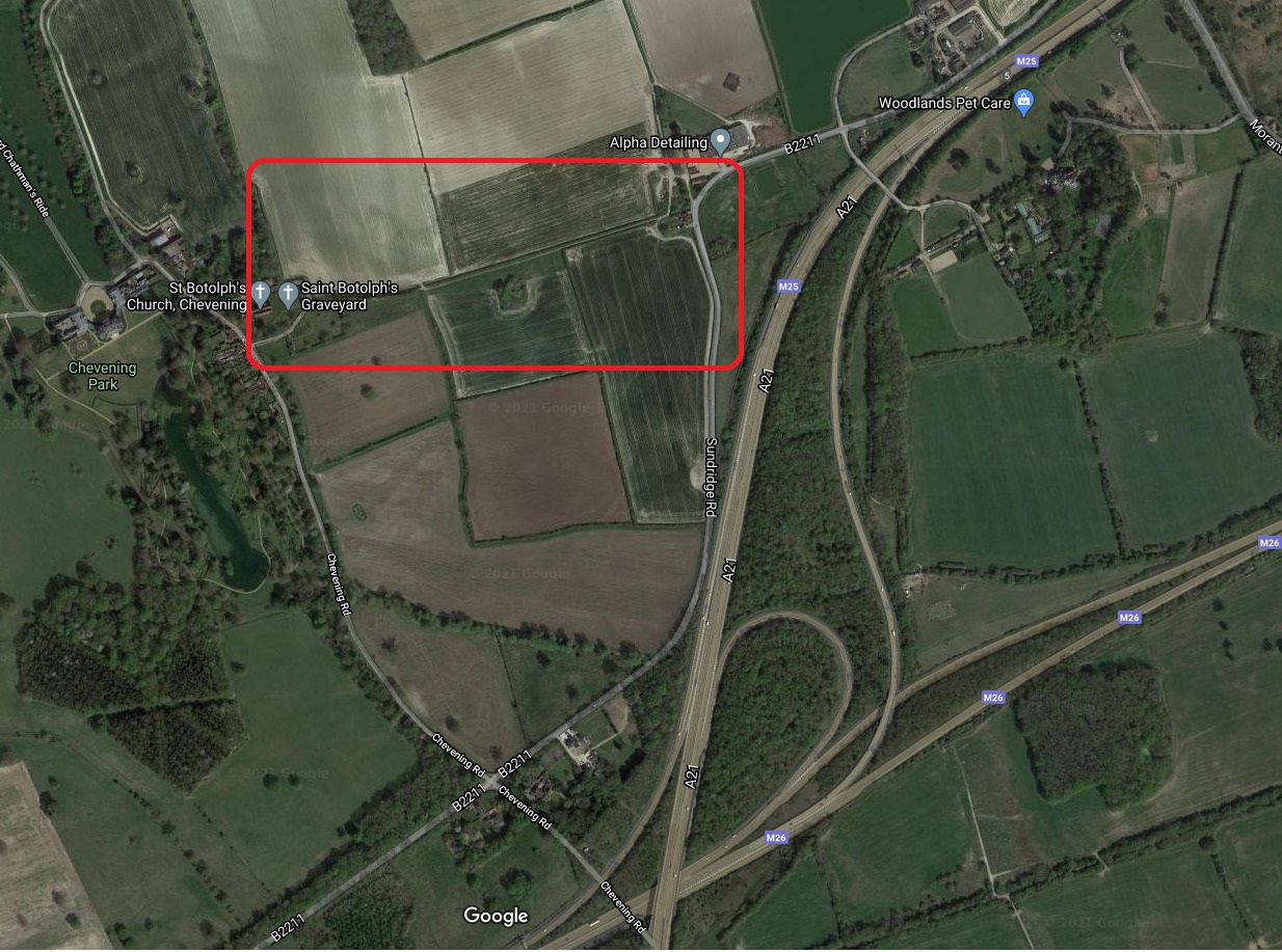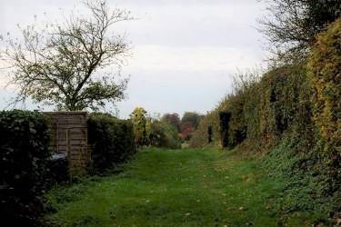 Continuing straight across the roundabout, the road heads toward Chevening, parallel with the M25.  After a short while it bends to the left. The old entrance starts alongside the cottages shown in the photo above. It extends for about on mile and emerges behind the churchyard of St. Botulph's church in Chevening.